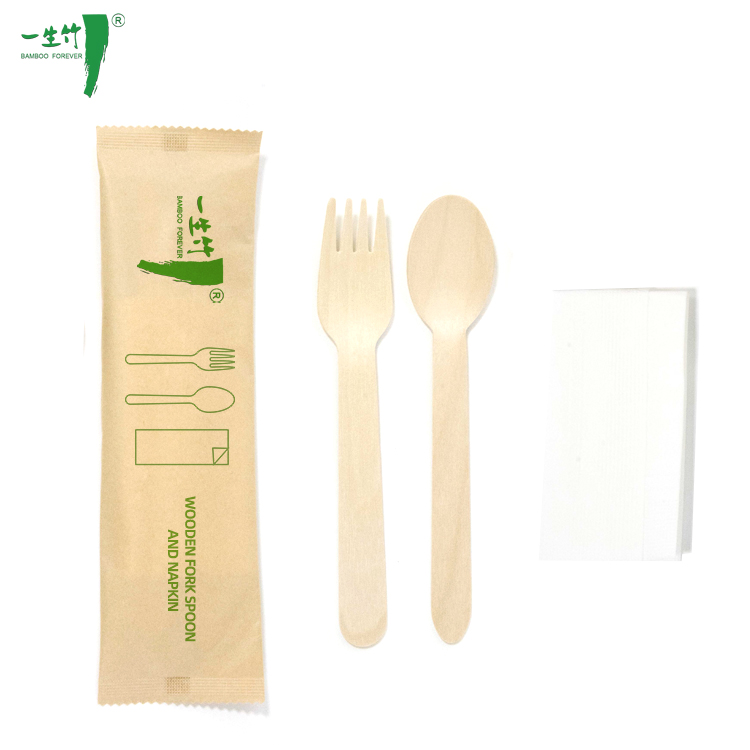 3-in-1-Besteck-Set aus biologisch abbaubarem Holz mit Gabel, Löffel und Serviette